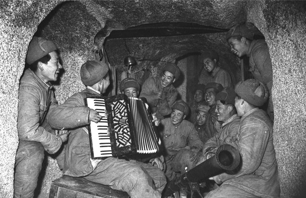 在朝鲜前线,虽然战斗激烈,生活艰苦,但中国人民志愿军战士始终保持着革命乐观主义精神。这是战斗间隙,坑道里的中国人民志愿军战士歌声、笑声不断(1952年摄)。新华社发(葛力群 摄)