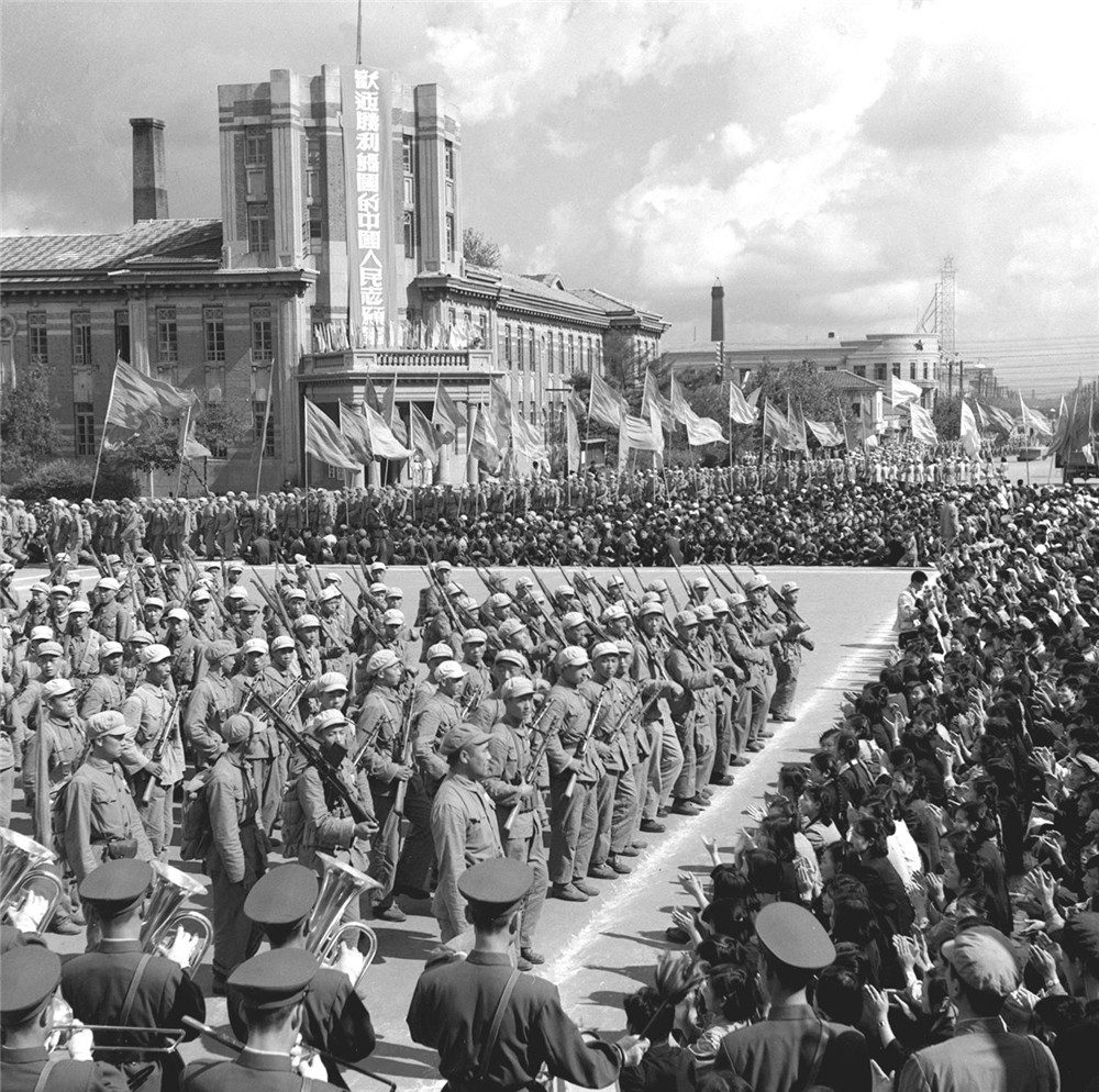 1954年9月20日,中国人民政治协商会议全国委员会、中国人民抗美援朝总会在安东市(今辽宁省丹东市)举行大会,欢迎中国人民志愿军归国部队。(新华社记者 蔡忠植 摄)