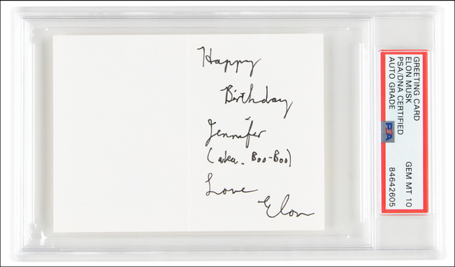 马斯克在那张生日卡片上写道:“生日快乐,詹妮弗”,他还特意写上了女友爱称“Boo-Boo”,落款签名则是“Love,Elon”。这张生日卡片以16643美元(约合人民币11.7万元)的价格成交。