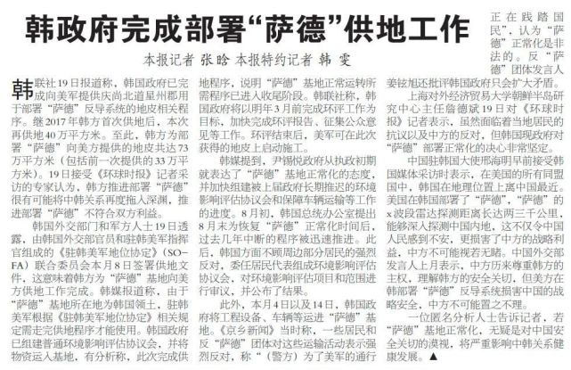 韩联社19日报道称,韩国政府已完成向美军提供庆尚北道星州郡用于部署“萨德”反导系统的地皮相关程序。继2017年韩方首次供地后,本次再供地40万平方米。至此,韩方为部署“萨德”向美方提供的地皮共达73万平方米(包括前一次提供的33万平方米)。19日接受《环球时报》记者采访的专家认为,韩方推进部署“萨德”很有可能将中韩关系再度拖入深渊,推进部署“萨德”不符合双方利益。