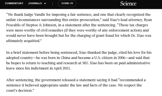 好在——根据《科学》杂志网站和《南华早报》的报道——审理此案的陪审团和法官没有认定美国司法部对肖明庆“欺诈罪”的指控,仅认定了他存在所谓的“纳税申报出错”和“未能披露自己有外国银行账户”等轻微罪名,最终让他免于牢狱之灾,只获得1年的缓刑。