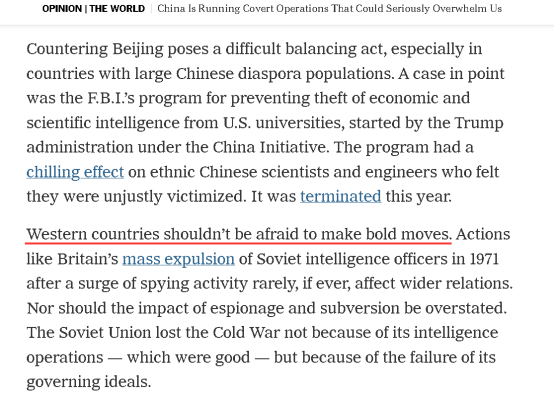 更让人感到可怕的是,就在肖明庆被判缓刑的5天前,英国军情六处前副处长奈杰尔·英克斯特(Nigel Inkster)刚在《纽约时报》上撰文一篇,极力鼓动西方国家要加大对所谓“中国间谍”的打击。他还尤其提到,虽然“中国行动计划”出了问题,但西方国家“不该害怕做出大胆的举动”。