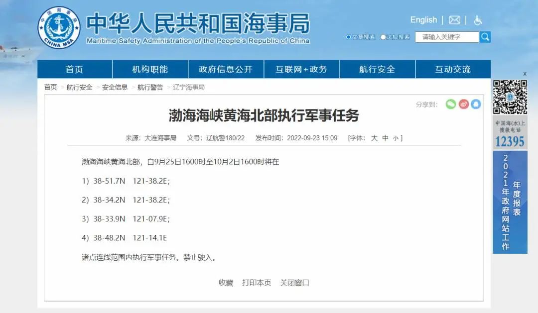 大连海事局发布航行警告,9月25日16时至10月2日16时,渤海海峡黄海北部部分海域执行军事任务,禁止驶入。