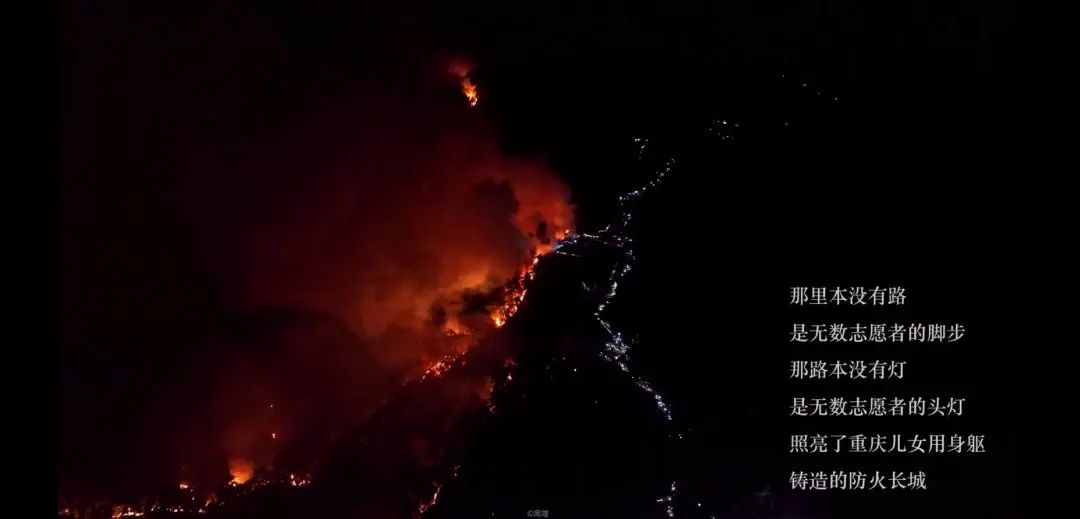 当晚回到家后,我随即处理当晚拍摄的现场画面,整个人都处在一种被现场灭火情形所触动、所激励的亢奋状态,于是通宵剪辑了一个视频,致敬每一个参与重庆山火扑救的英雄。第二天早上8点发布出来,10点左右就在网络传开了,甚至还被外交部发言人的两位老师在外网转发,致敬中国人民,致敬中国森林消防。有网友将我拍的那张“人”字照片取名为“人定胜天”,也有人说整个画面发光的部分像一只凤凰。其实,我觉得这张照片像什么不重要,重要的是我们胜利了!
