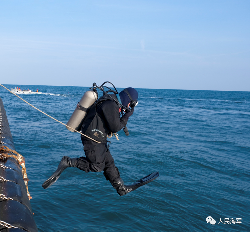 携带氧气瓶从甲板跳水下潜作业