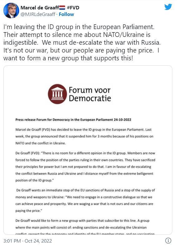 格拉夫在推特上发文感叹道:“‘认同与民主’党团中没有容纳不同意见的空间。现在,其成员被迫遵循各自国家执政党的立场。他们为了权力牺牲了自己的原则,但我不准备这么做。”他还说,“我赞成降低俄乌冲突的级别,我与‘认同与民主’党团的极端好战的立场保持距离。我们正在发动的是一场不属于我们的战争,而我们的公民正在为此付出代价。”