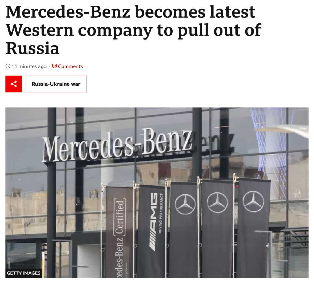 当地时间26日,德国汽车制造商梅赛德斯-奔驰表示将退出俄罗斯市场,并将其子公司的股份出售给当地汽车连锁经销商Avtodom。英国广播公司报道称,这是俄乌冲突以来最新一家退出俄罗斯市场的汽车制造商。