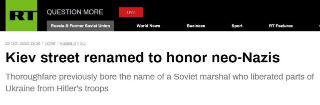 据“今日俄罗斯”电视台(RT)网站26日报道,乌克兰首都基辅一条以苏联元帅罗季翁·马利诺夫斯基的名字命名的主要街道在周三正式被改名,理由是为了纪念“亚速营”的“英雄”。俄媒报道称,“亚速营”的许多成员在公开宣扬新纳粹意识形态。