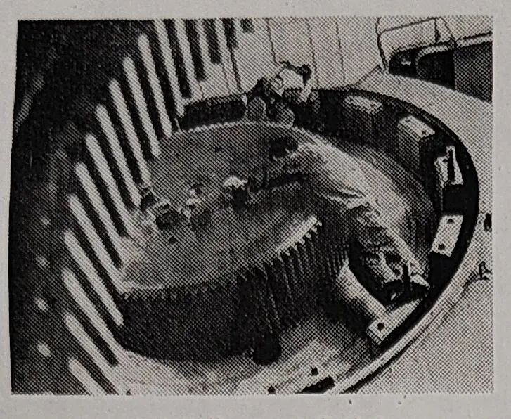1983年1月9日,攻关项目正式启动。数九寒天,于永仁和王殿忠从富拉尔基赶到十堰,蔡福良和他的助手也都到齐,一进现场就率领精兵动手拆检。经过拆检,我们发现设备不能运转的主要问题之一是离合器的自重过大。主轴约重34吨,而主轴一端的离合器直径足足有4米多、重约80吨。运作起来主轴就会像挑了一头沉的重担而倾斜,这就会造成轴瓦局部超载,继而烧损、收缩,与钢套间出现大面积间隙。