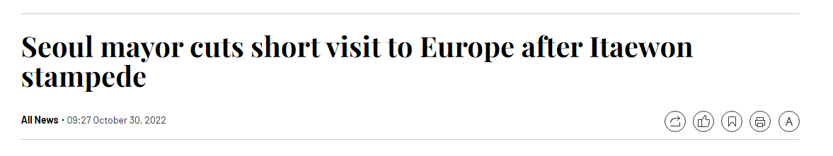 据韩联社报道,事故发生后,首尔市长办公室当地时间30日称,市长吴世勋已缩短访欧行程,正赶回韩国。报道称,吴世勋预计于当地时间31日回到韩国。