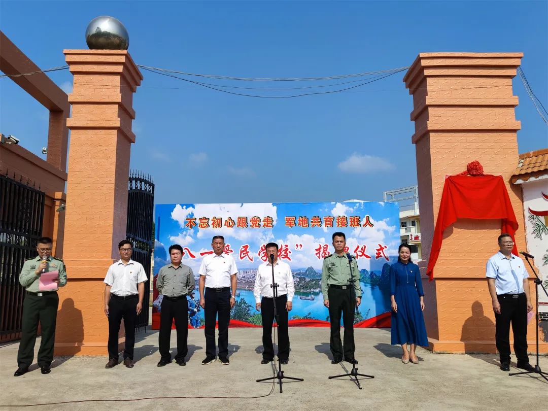 双拥花开盛,鱼水情更浓。10月28日,“八一爱民学校”在来宾市武宣县东乡镇河马小学挂牌成立。河马小学作为来宾军分区结对帮扶对象,是军分区与武宣县人民政府共同打造以全县红色资源为依托,以深化国防教育为特色的军地共建示范学校。