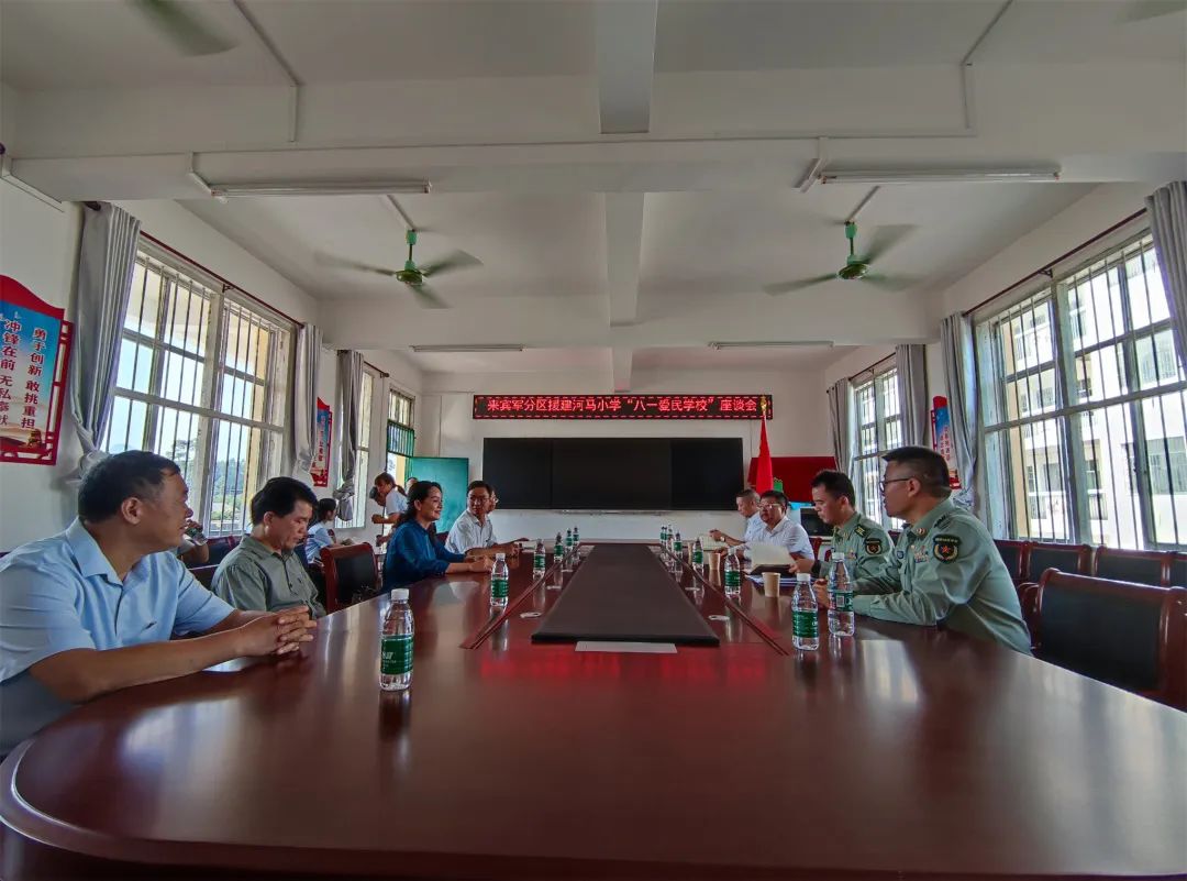 仪式后,军地双方领导在河马小学会议室召开座谈会。军分区政治工作处主任表示,军分区帮扶援建的东乡镇河马小学被确定为“八一爱民学校”,这是分区部队弘扬红色精神,回报革命老区的实际行动,体现了分区部队拥政爱民的光荣传统,实现了拓展巩固当地教育脱贫攻坚成果与乡村振兴的有效衔接。