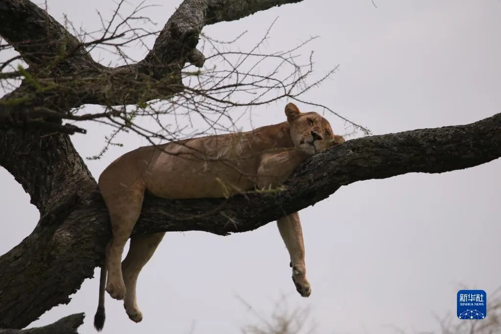 2月10日,在坦桑尼亚塞伦盖蒂国家公园,一只狮子在树上休息。