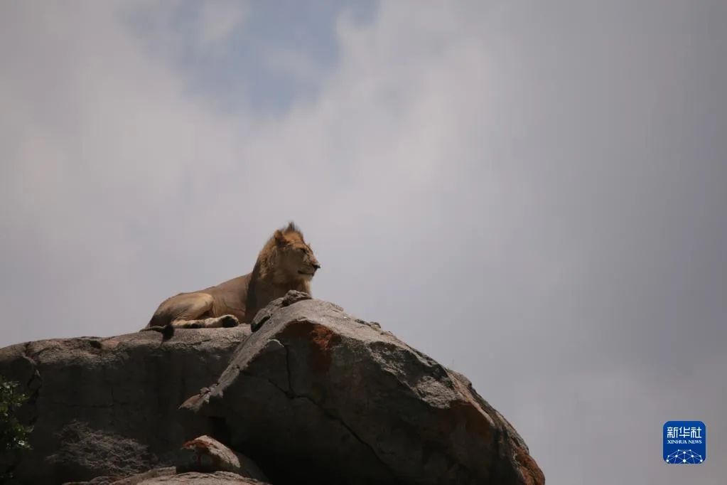 2月11日,在坦桑尼亚塞伦盖蒂国家公园,一只狮子在岩石上休息。