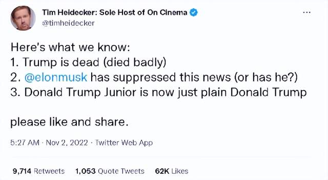 不过,尽管这是个非常明显的假消息——特朗普本人不仅没死,还活得好好的——但最初发布这则消息的美国喜剧演员Tim Heidecker,以及众多传播这则消息美国网民,其实针对的并不是特朗普,而是前不久刚刚收购了“推特”平台,并决定亲自担任该平台首席执行官的美国企业家埃隆·马斯克。