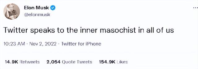 但他在此事发酵后的一则贴文中写下了这么一句话:“推特与我们所有人内心中的那个受虐狂产生了共鸣。”