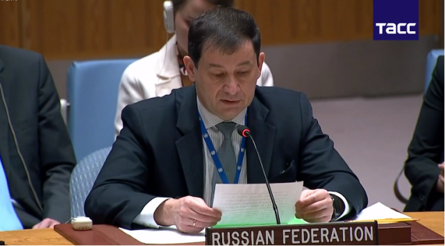 波利扬斯基当地时间11月2日在联合国安理会会议上发言的画面,图源:塔斯社