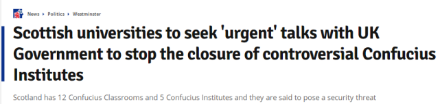 《泰晤士报》一篇报道的标题倾向性明显,称苏格兰的大学们“为了保住北京的间谍机构而战”。