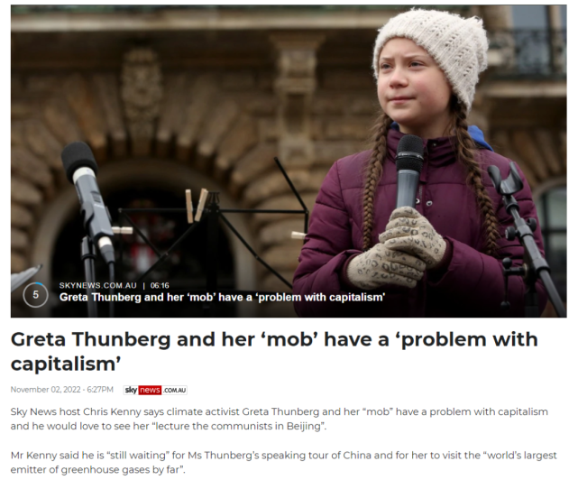 天空新闻澳大利亚分社的主持人克里斯·肯尼在节目中大骂桑伯格的支持者是“暴徒”,他污蔑称中国造成了全球最多的温室气体排放,他希望桑伯格可以把那番对资本主义的批判拿去批评中国。另一家保守派媒体也怒斥桑伯格,让她“去教育中国不要破坏环境”。