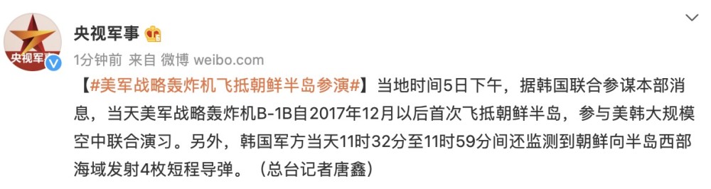 据@央视军事 微博消息,当地时间5日下午,据韩国联合参谋本部消息,当天美军战略轰炸机B-1B自2017年12月以后首次飞抵朝鲜半岛,参与美韩大规模空中联合演习。另外,韩国军方当天11时32分至11时59分间还监测到朝鲜向半岛西部海域发射4枚短程导弹。