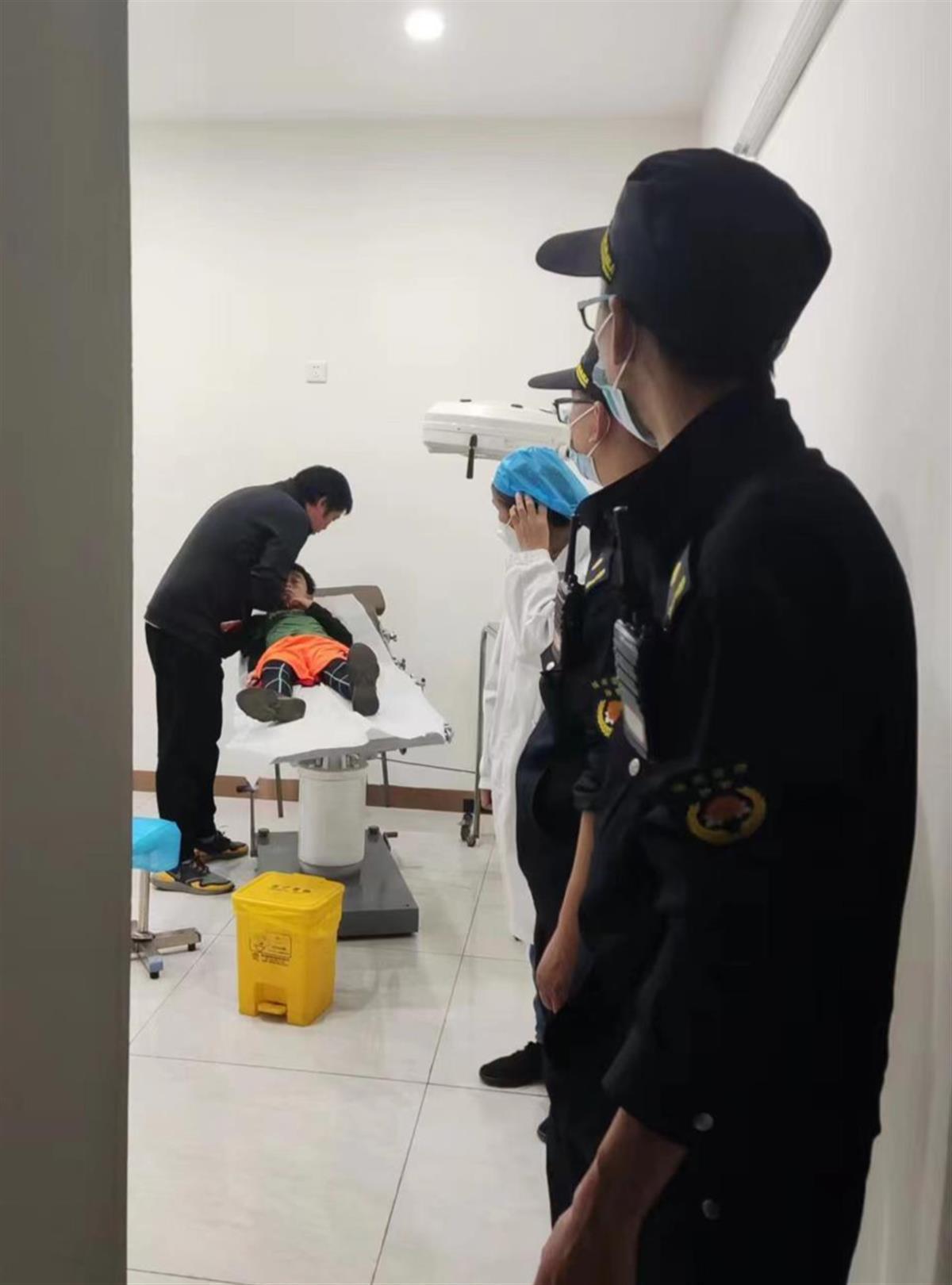 城管协管员魏玮和周黎陪同受伤男孩在社区医院检查