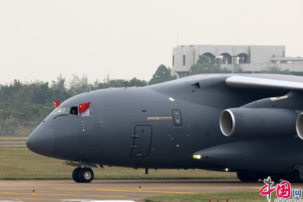 运油-20落地后,驾驶舱窗口竖起两面国旗。中国网杨佳摄影
