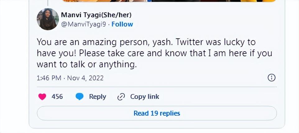 有人留言说,“亚什,你是个很棒的人,推特能有你真是幸运!保重并要相信,我就在这里,可以和你聊聊”。↓