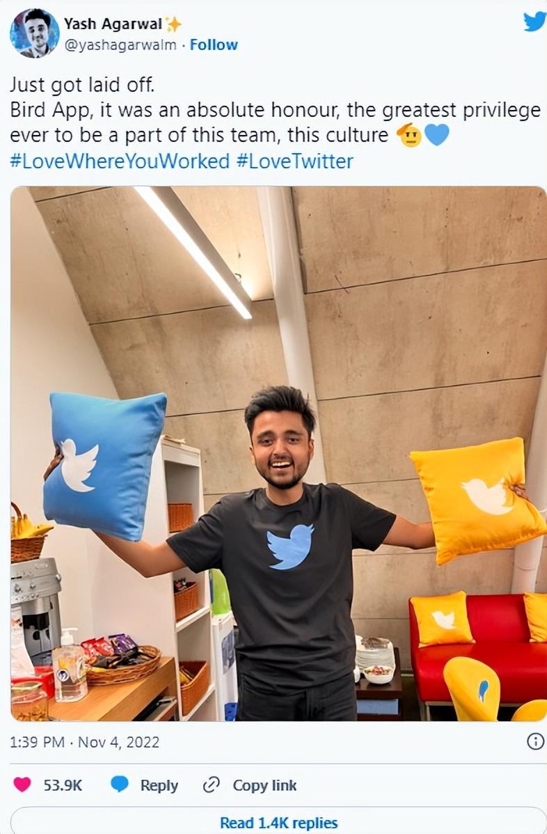 被裁掉的亚什在推特上分享了自己微笑的照片,并配文“刚刚被裁员。推特,曾经作为其中一员,是绝对的荣耀,是最大的荣誉……”他还在推文中配了两个标签,#爱自己工作的地方#爱推特。