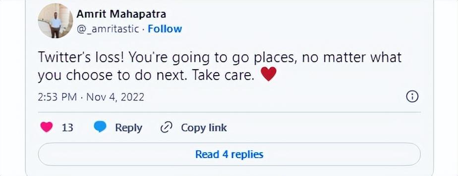 还有人说,“真是推特的损失!你一定会去别的地方,不论下一站选择哪里。保重”。↓