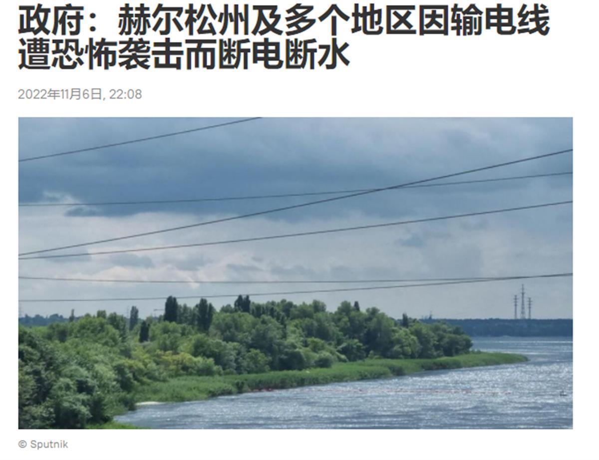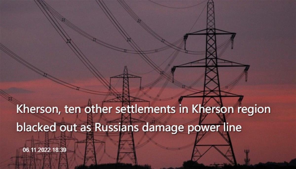 乌通社11月6日报道称,赫尔松地区的定居点因俄罗斯人损坏电力线而停电。当地一名官员尤里·索博列夫斯基在社交媒体上说,一条高压输电线受损。俄军已经“报告”发生了恐怖袭击。但是,他们没有说明他们自己实施了恐怖袭击。这名官员补充说,目击者的证词证实,是俄军破坏了高压输电线。