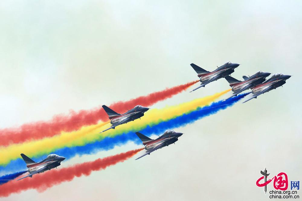 八一飞行表演队六机编队拉烟通场。中国网记者 杨佳摄影