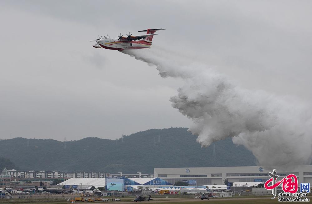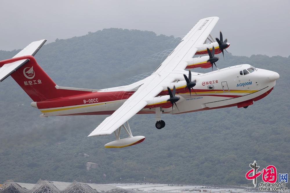鲲龙AG600M水陆两栖飞机进行了投水表演,据了解该改进型投水量为12吨,高于原型9吨。中国网记者 杨佳摄影