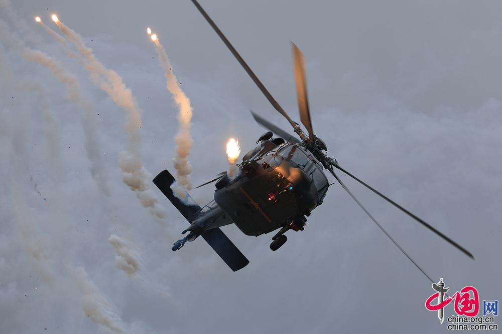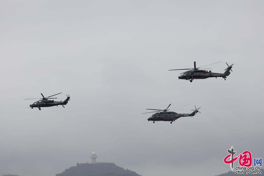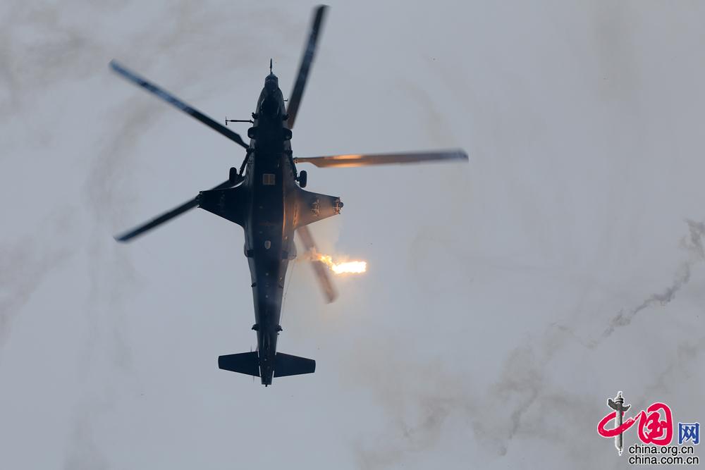陆航武直10、直20、直8L编队起飞。表演中武直-10、直-20释放干扰弹,直8L挂载运送了山猫全地形突击车。中国网记者 杨佳摄影