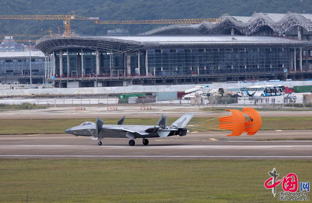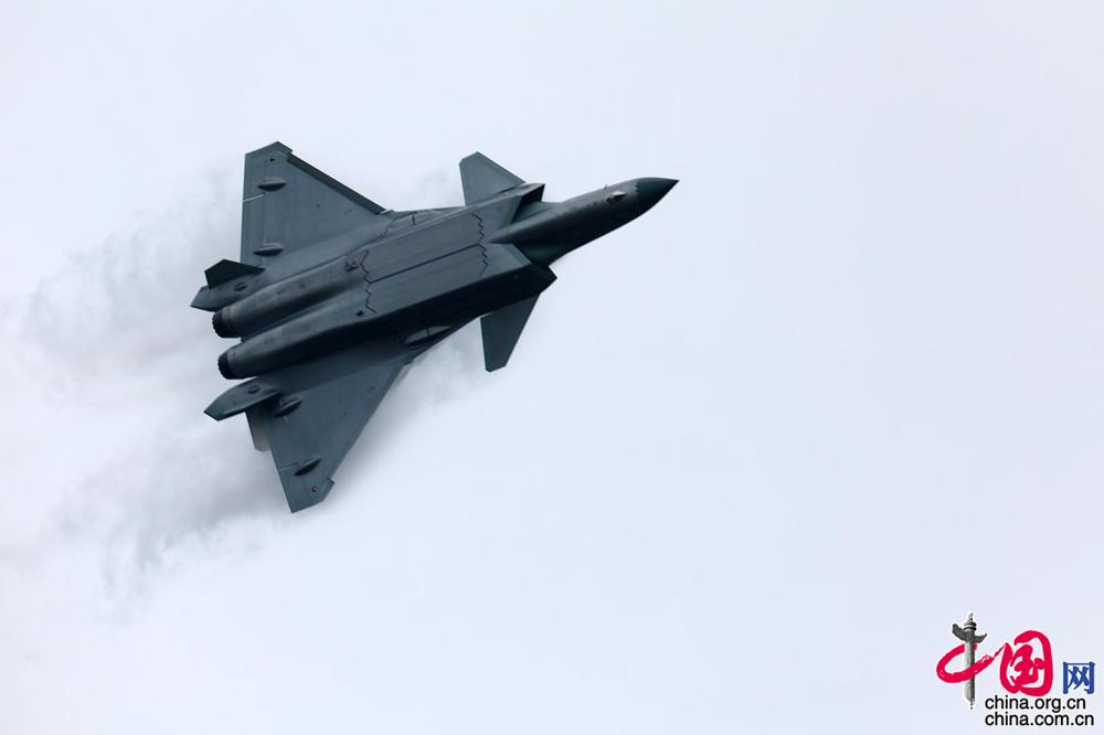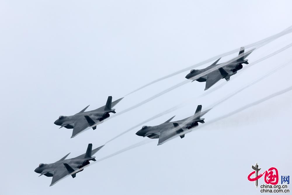 四架歼-20编队抵达,四机、双机、单机分别进行了拉升、滚转、连续小距离转弯等动作,随后两架歼-20落地金湾机场。中国网记者 杨佳摄影