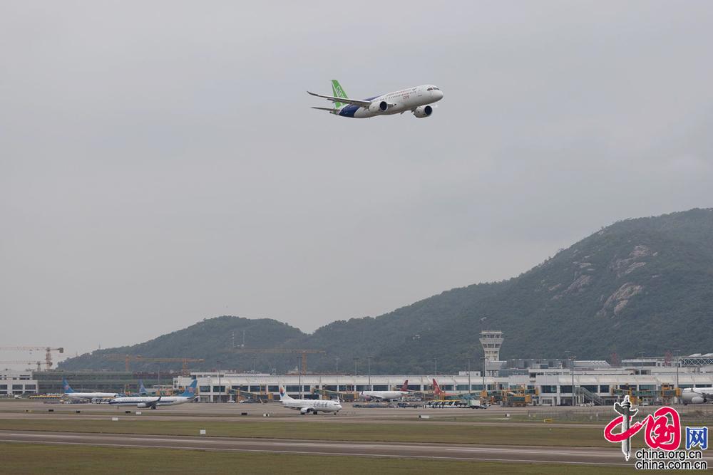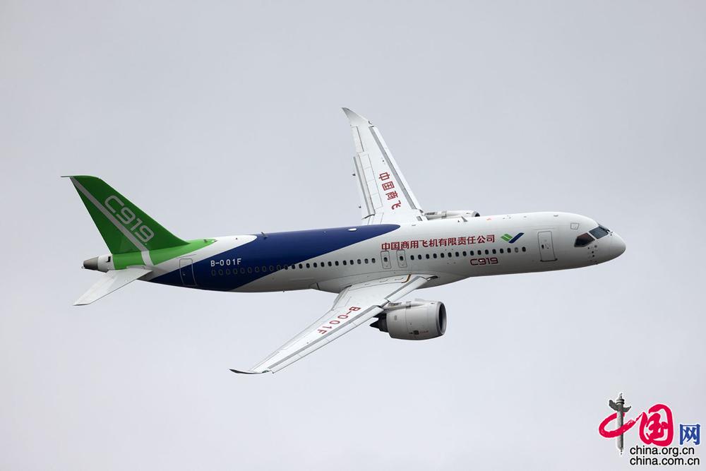 国产大飞机C919一出场就进行了大角度爬升,随后表演了低空通场等动作。中国网记者 杨佳摄影