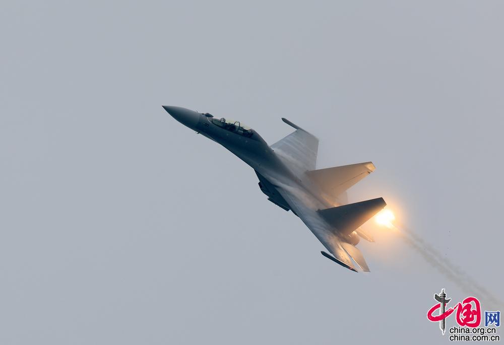 歼-16单机表演了小半径连续转弯、倒飞、释放干扰弹等动作。中国网记者 杨佳摄影