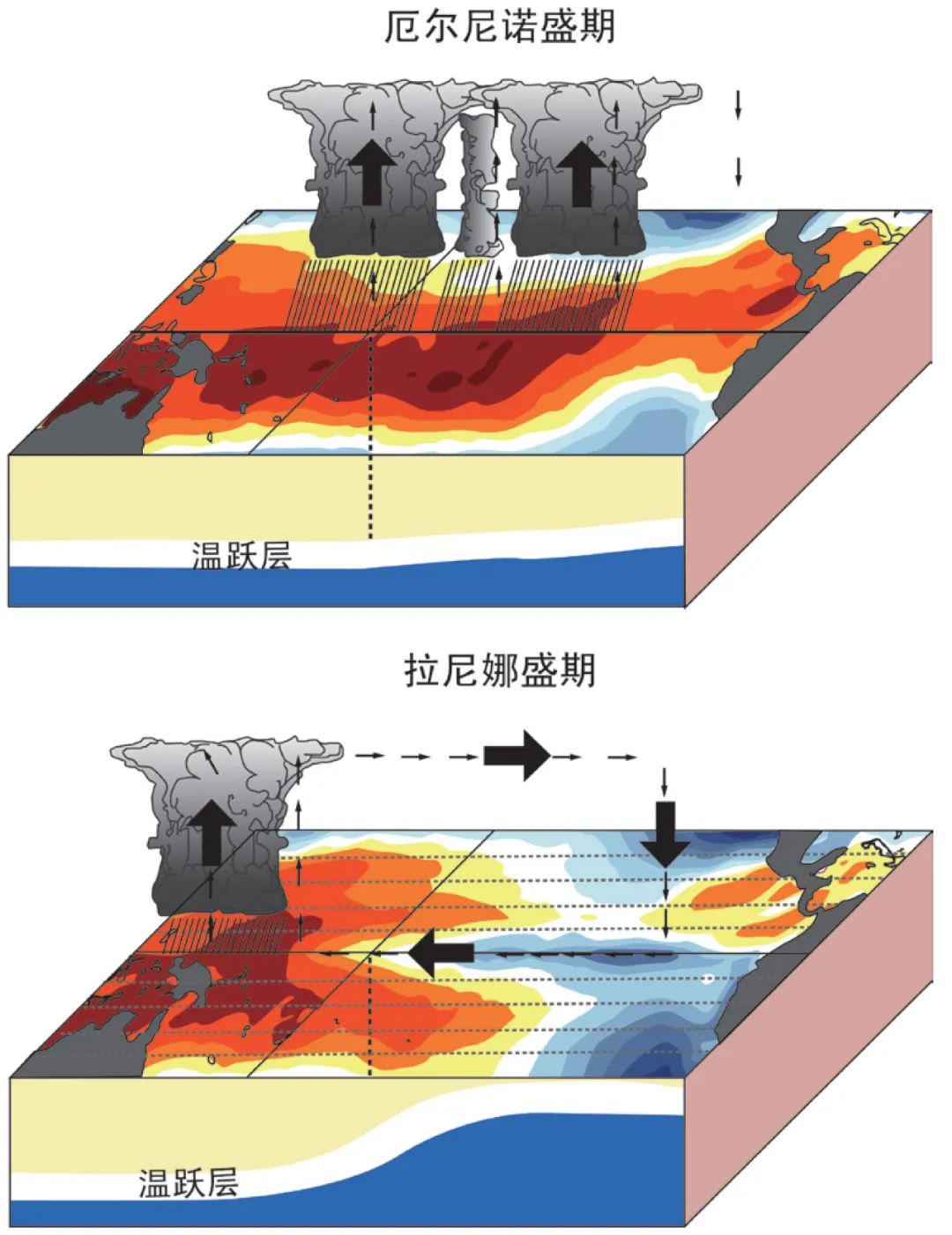 厄尔尼诺(上)和拉尼娜(下)盛期示意图