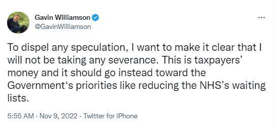 周二晚些时候,威廉姆森发推文称,他辞职后不会领取任何遣散费,称“这是(英国)纳税人的钱,应该用在政府的优先事项上,比如缩短英国国家医疗服务体系(NHS)的候诊病人名单。”