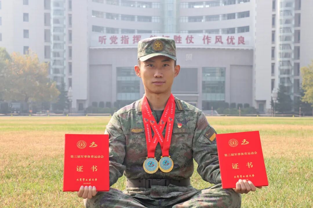 袁桢彬:时隔一年,重返军体运动会的赛场,我的目光愈发坚定。上场前定下的目标,激励着我不断向着自己的极限冲锋。那些赛前一圈圈直到跑到干呕的训练,此刻成为了我心里最大的底气。比赛并不是终点,相反,我已经做好了迎接人生更大挑战的准备。未来,我将永葆敢于斗争的勇气,以时不我待的精神,争取前方的一个又一个胜利。