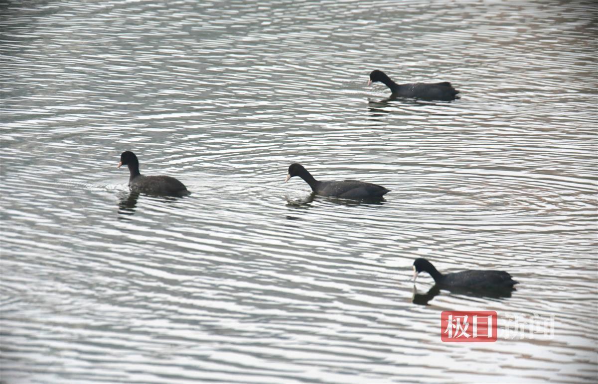 11月9日,极目新闻记者在湖北十堰竹山县堵河廊桥下的河水里看到,一群似鸡非鸡,似鸭非鸭的“四不像”水鸟在河面上游弋,它们浑身漆黑,头部中央以及嘴巴是白色,一旦有人靠近就受到惊吓,迅速钻入水中躲避或直接从水面飞走,动作十分敏捷。