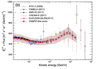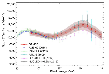 “悟空”合作组于2019年、2021年先后发布了质子与氦核宇宙线的能谱测量结果,第一次以高置信度发现了能谱在高能的变软结构,这些发现对宇宙线加速、传播等物理过程具有重要意义。