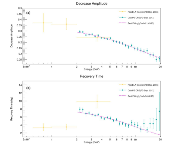 图 5:悟空卫星2021年发布的因为太阳活动导致电子宇宙线下降幅度(上图)、恢复时间的特征(下图)