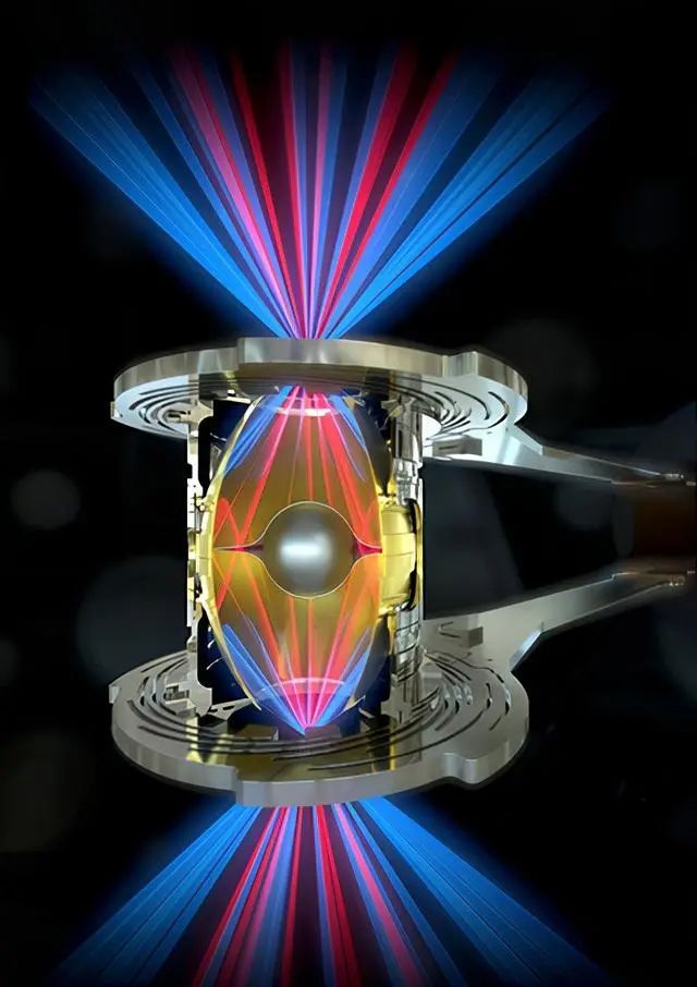 在这些激光束所聚焦的地方,放置了一个黄金制成的“黑腔”。黑腔的中心就是靶丸,直径只有2~3mm。