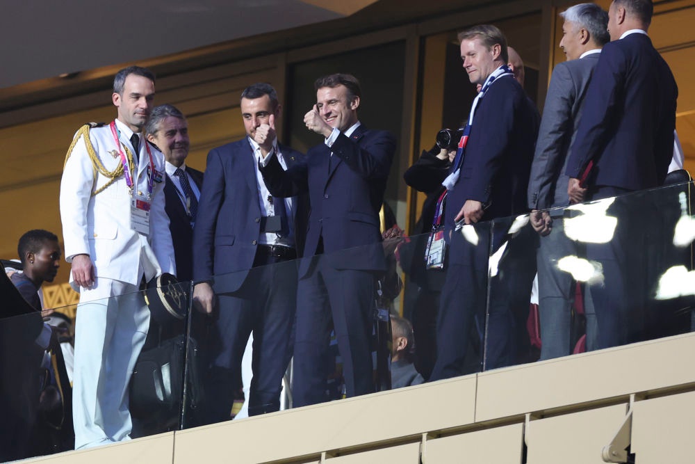 ↑法国总统马克龙(中)出席闭幕式。新华社记者 曹灿 摄