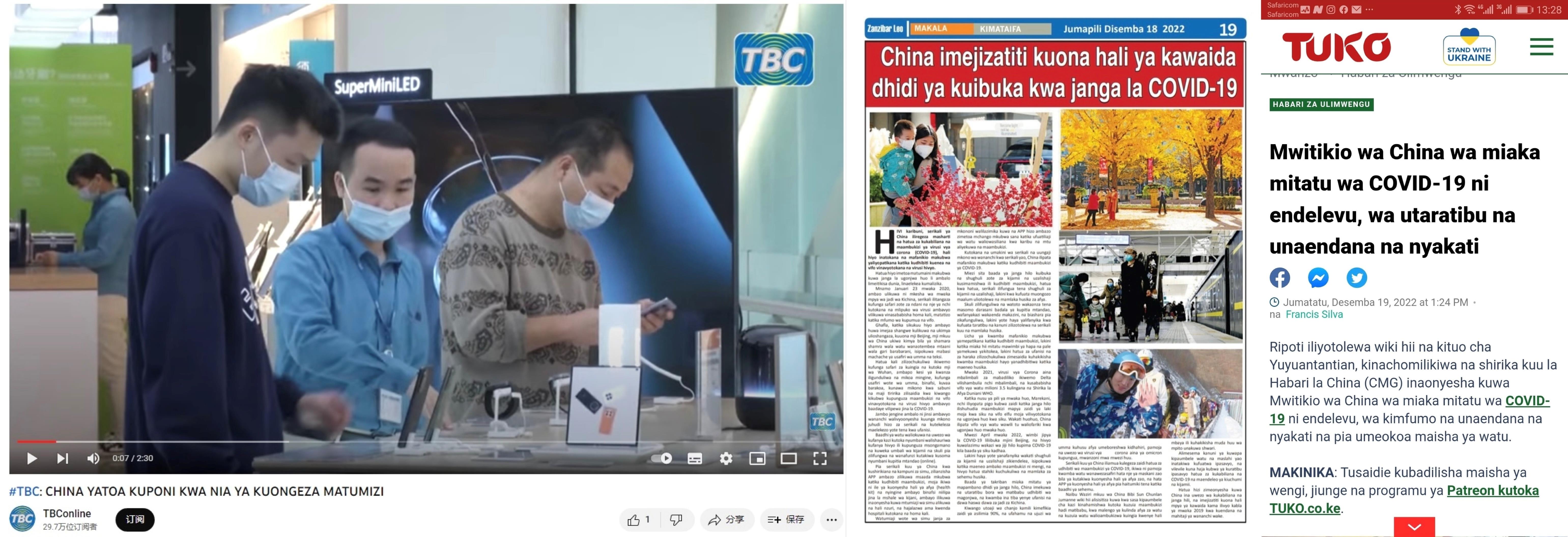△坦桑尼亚国家电视台、坦桑尼亚《今日桑给巴尔报》、肯尼亚TUKO新闻网刊发有关中国三年抗疫成果的报道