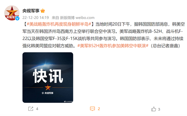 据央视军事报道:当地时间20日下午,据韩国国防部消息,韩美空军当天在韩国济州岛西南方上空举行联合空中演习。美军战略轰炸机B-52H、战斗机F-22以及韩国空军F-35及F-15K战机等共同参与演习。韩国国防部表示,未来将通过持续强化韩美同盟应对朝方威胁。