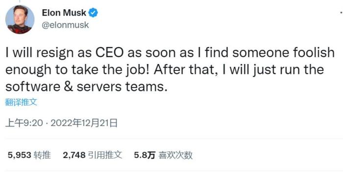 中新网12月21日电 据美国有线电视新闻网(CNN)报道,当地时间20日晚,推特老板马斯克在推特发文称,自己将辞去推特CEO一职,但前提是找到“傻到可以接任这项工作”的人。