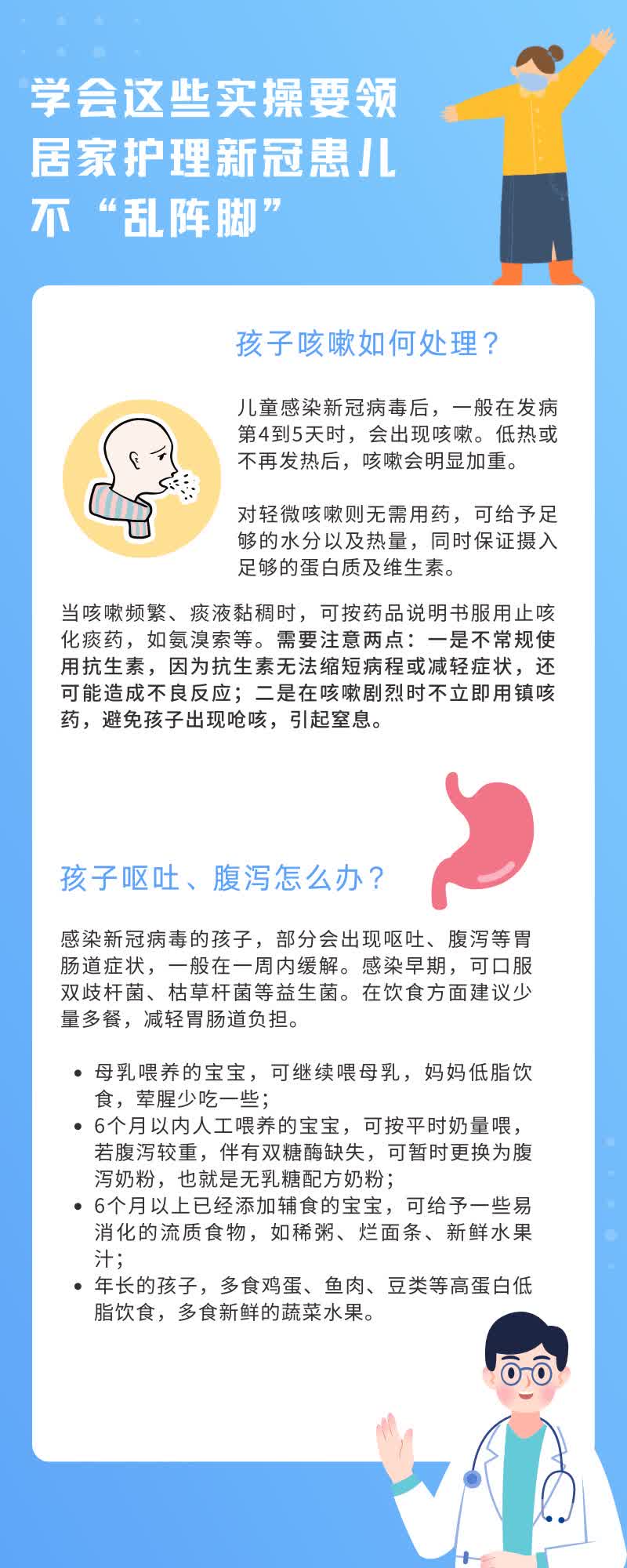 儿童新冠感染者的居家护理是众多家长关注的问题,重庆医科大学附属儿童医院的护理专家针对常见的发热、咳嗽、呕吐腹泻等症状该如何护理,给出了一系列操作建议和禁忌提醒,让家长们“临阵不乱”。