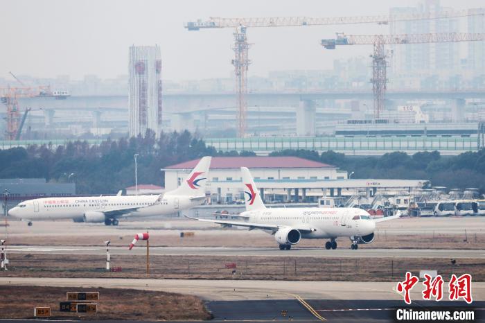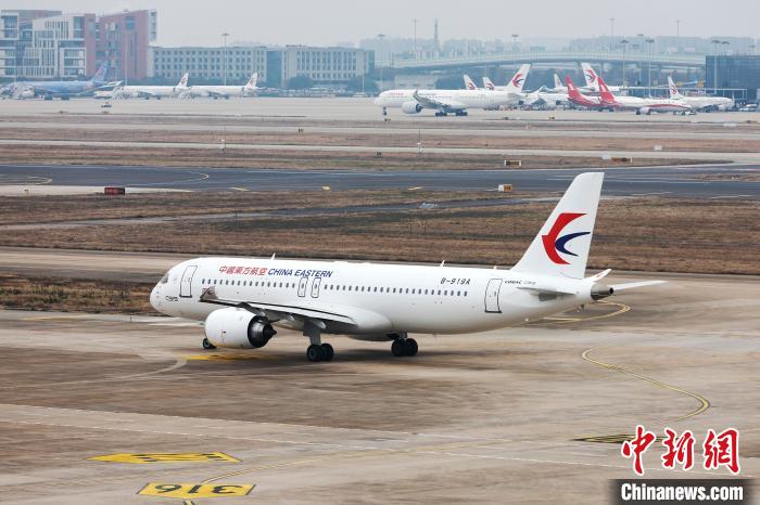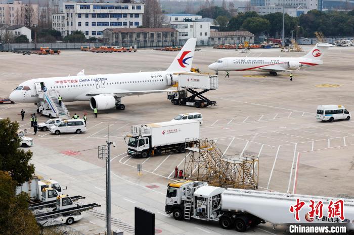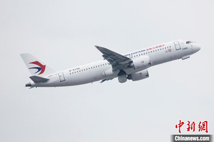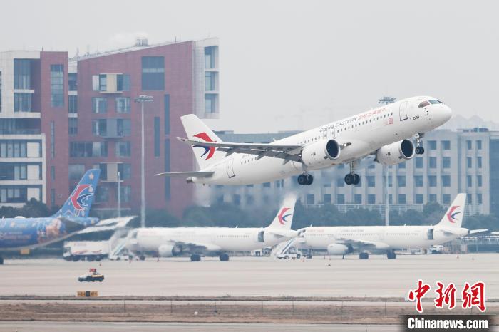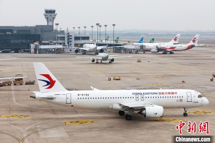 东航全球首架C919客机从虹桥机场起飞前往北京。