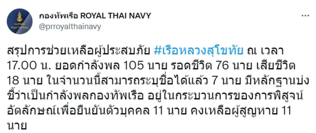 当地时间12月18日23点30分,泰国皇家海军护卫舰“素可泰”号因恶劣天气在泰国巴蜀府附近海域沉没。事发时舰上共105人,现有76人获救上岸,18人死亡,11人仍下落不明。